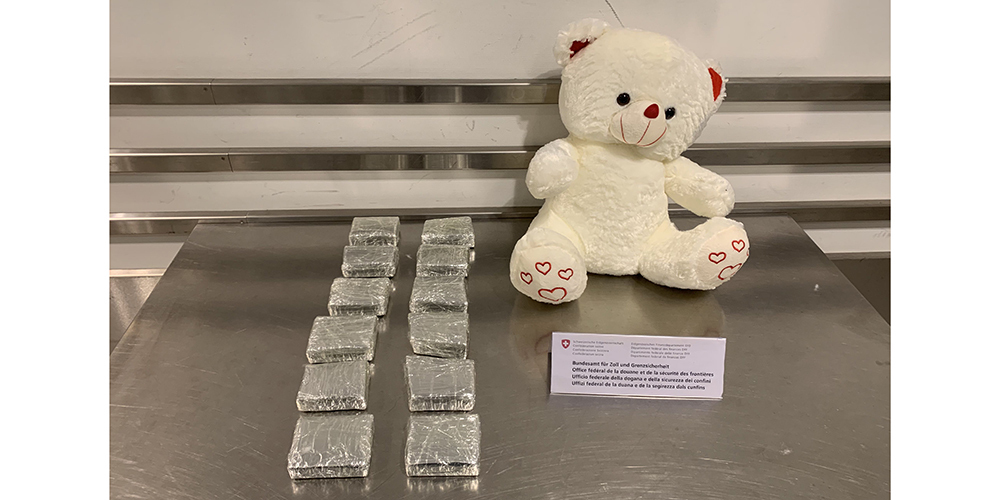 Zürich-Flughafen: Bei einer am 12. Oktober 2022 durchgeführten Kontrolle von Transitpaketen am Flughafen Zürich zeigte der fünfeinhalbjährige Diensthund Gino bei einer der Sendungen an. Sie hätte von Johannesburg nach Madrid gelangen sollen. Beim anschliessenden Röntgen stellten die BAZG-Mitarbeitenden ungewöhnliche Päckchen fest, woraufhin sie die Sendung öffneten. Zum Vorschein kam ein Teddybär, der allerdings überraschend schwer war – und zwölf Päckchen Haschisch mit einem Gesamtgewicht von rund 3,2 Kilogramm enthielt, wie sich nach dem Aufschneiden des Plüschtiers zeigte. Das Betäubungsmittel wurde sichergestellt und der Kantonspolizei Zürich übergeben.