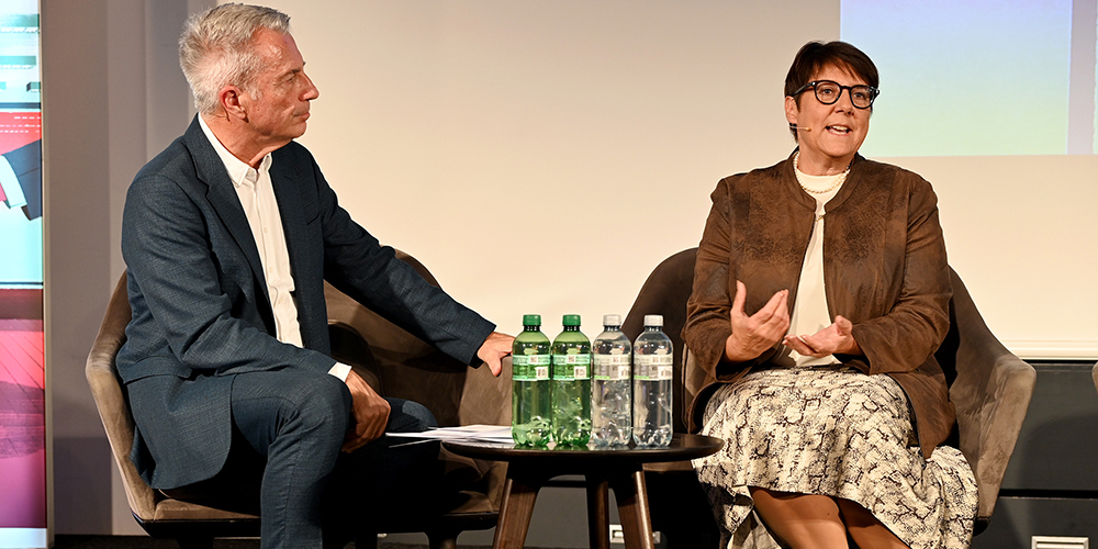 Moderator Reto Lipp und Petra Steimen-Rickenbacher, Regierungsrätin und Vorsteherin Volkswirtschaftsdepartement. Bild: Rafael Muñoz10 / 14 -