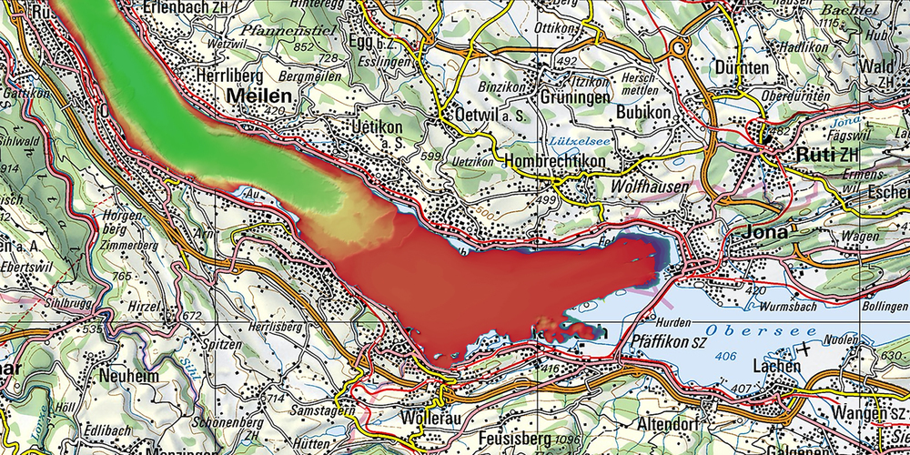 Das Bundesamt für Landestopografie Swisstopo hat eine neue Karte veröffentlicht, die online einsehbar ist. Die sogenannte bathymetrische Karte zeigt das Relief des Seegrundes. Auf den ersten Blick fallen vor allem die unterschiedlichen Seetiefen auf, welche einem Farbraster folgend eingefärbt wurden. Der Zürichsee zwischen Bäch und Rapperswil ist vorwiegend rot eingefärbt, das entspricht einer Tiefe von 20 bis 30 Metern. Die tiefste Stelle des Zürichsees ist grün eingefärbt, sie befindet sich zwischen Oberrieden und Herrliberg und misst 136 Meter. Die Daten wurden Swisstopo von Flavio Anselmetti zur Verfügung gestellt. Anselmetti ist Direktor des Instituts für Geologie an der Universität Bern und zuständig für die Kartografierung der Seen.